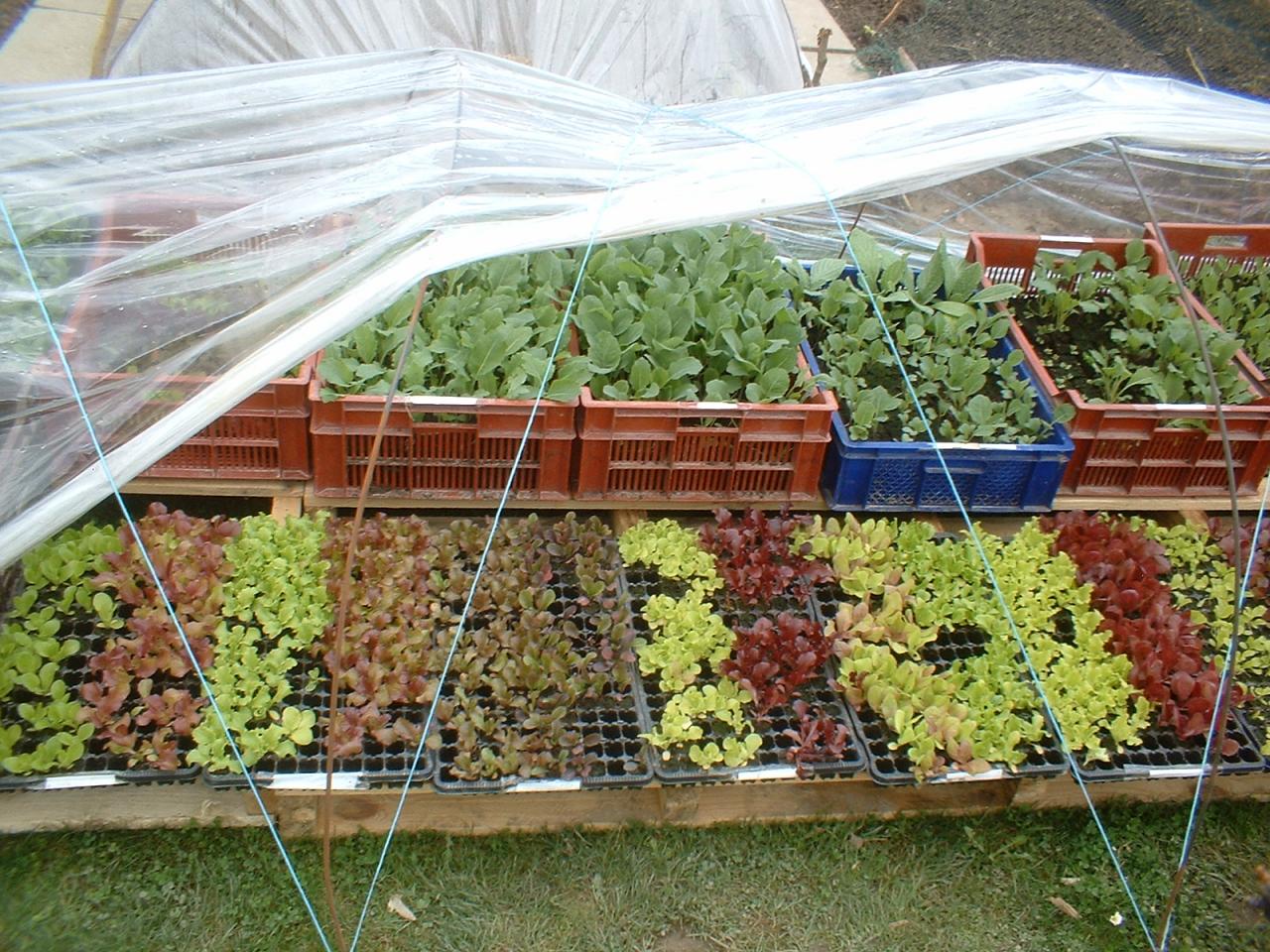 Salades devant, choux pr^ts à planter (8 semaine après semi) derrière
